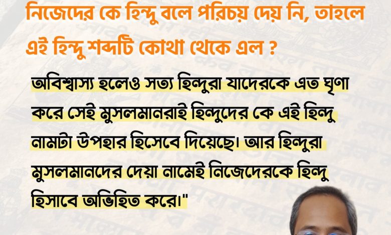 বেদ, পুরাণ, উপনিষদের কোথাও হিন্দু ধর্ম শব্দটি খুঁজে পাওয়া যায় না, হিন্দুদের কোন দেব-দেবীও নিজেদের কে হিন্দু বলে পরিচয় দেয় নি, তাহলে এই হিন্দু শব্দটি কোথা থেকে এল ? অবিশ্বাস্য হলেও সত্য হিন্দুরা যাদেরকে এত ঘৃণা করে সেই মুসলমানরাই হিন্দুদের কে এই হিন্দু নামটা উপহার হিসেবে দিয়েছে। আর হিন্দুরা মুসলমানদের দেয়া নামেই নিজেদেরকে হিন্দু হিসাবে অভিহিত করে।
